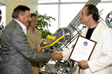 Nuotr. S.Brunza (kairėje) įteikia patikimumo ženklą “A1 alternatyva” tinklo vadovui M.Dainauskui.
