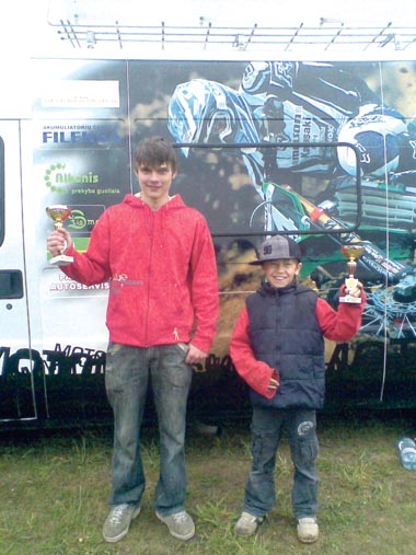 Nuotr.Bronza. „Semos“ motociklininkai (iš kairės) P.Galinis ir M.Buzūnas su tre-čios vietos apdovanojimais po varžybų Plungėje.