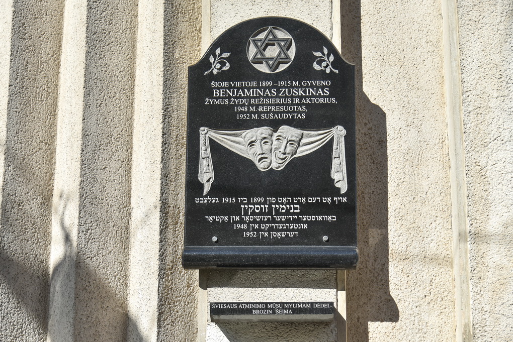 Birutės gatvėje ant teatro „Menas“ galinės sienos kaba paminklinė lenta žymiam žydų kino ir teatro aktoriui Benjaminui Zuskinui. Gimęs ir augęs Panevėžyje būsimasis aktorius Pirmojo pasaulinio karo metais išvyko į Rusiją. Nusipelnęs Rusijos Tarybų Federacinės Socialistinės Respublikos artistas buvo ir antifašistinio žydų komiteto narys, vėliau sovietų valdžios sušaudytas. Pasak G. Kofmano, minint antifašistinio žydų komiteto sukaktį, kilo mintis įamžinti jo žmones, kilusius iš Lietuvos. B. Zuskinas, kartu su Daugpilyje gimusiu Valstybinio žydų teatro direktoriumi Solomonu Michoelsu, buvo šio komiteto nariais. Pastarasis buvo pirmuoju jo pirmininku. Atsitiktinai paaiškėjo, kad šio pusbrolis gyveno Panevėžyje, Ramygalos gatvėje.
