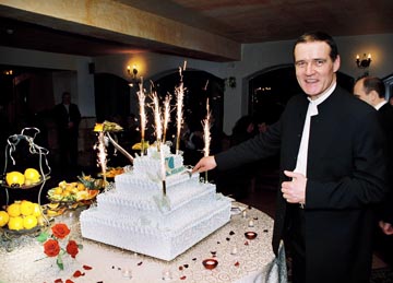 Nuotr. “Kelio” įkūrėjas ir vadovas A.Kuklierius pjausto tortą svečiams savo bendrovės 15-ojo gimtadienio šventėje.