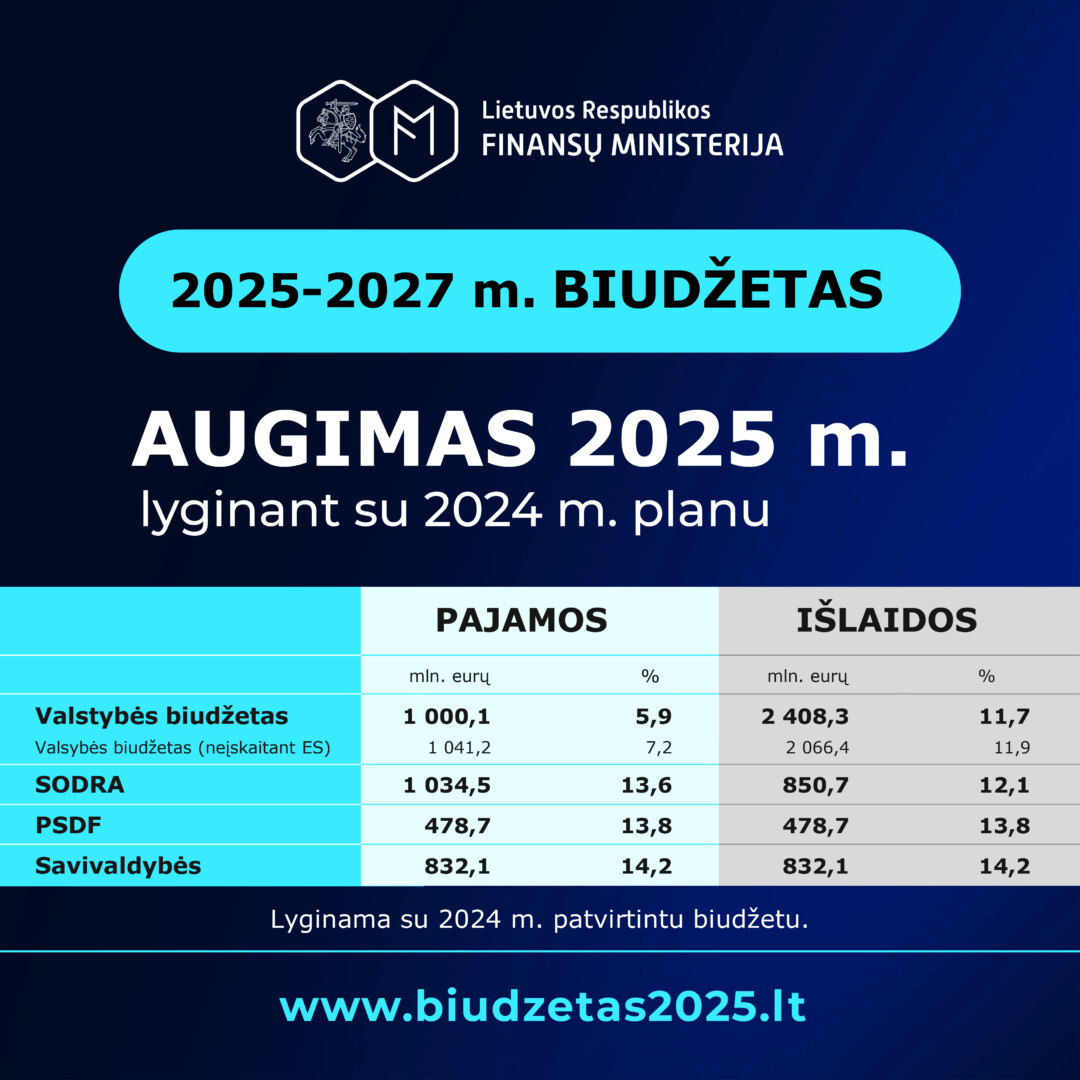 2025 m. biudžetas jau nuo pirmų dienų pradeda įgyvendinti naujos Vyriausybės programos nuostatas, daugiau dėmesio skiriant šalies išorės ir vidaus saugumo situacijai gerinti, Lietuvos keliams, mokinių neformaliajam ugdymui.