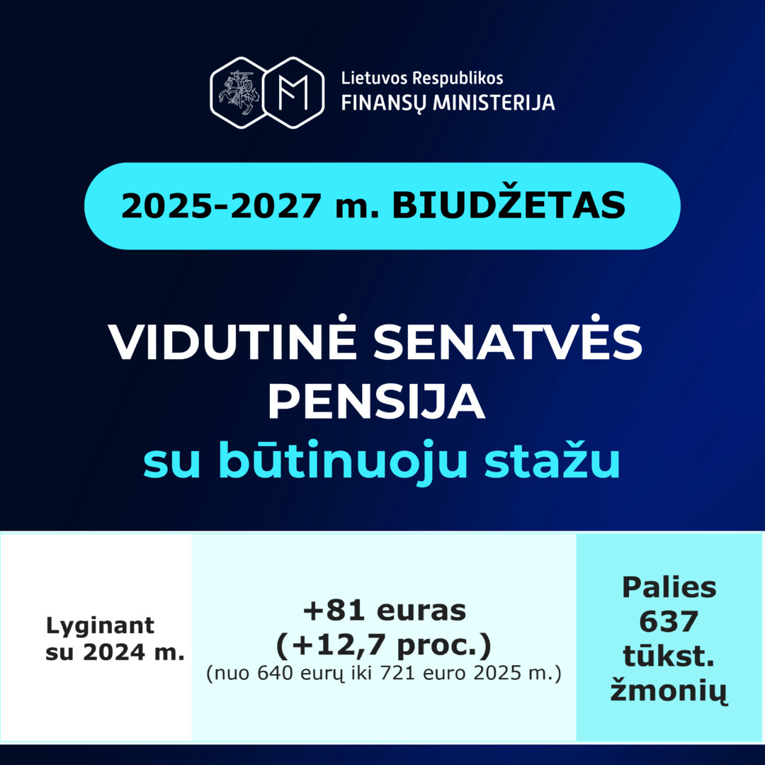 Senatvės pensijos 2025 m. didės 12,7 proc., tam numačius 616 mln. eurų, kurie vidutiniškai reikš 81 euro didėjimą kas mėnesį būtinąjį stažą turintiems senjorams (pensija didėja nuo 640 eurų iki 721 eurų). Šis sprendimas palies 637 tūkst. žmonių.