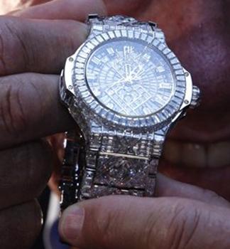 Rankinį laikrodį, papuoštą daugiau kaip 1,2 tūkstančio briliantų, trečiadienį pademonstravo Šveicarijos kompanija „Hublot“. Firma priklauso grupei „Louis Vuitton Moet Hennessy“, kuri specializuojasi gaminti prabangos prekes.