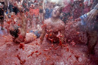 Tūkstančiai Ispanijos gyventojų ir turistų dalyvavo pomidorų mūšyje, surengtame per kasmetinę “La…