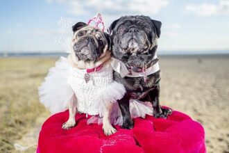 Australijoje įvyko dviejų mopsų vestuvės, per jas nuotaka buvo aprengta suknele, atsiėjusia…