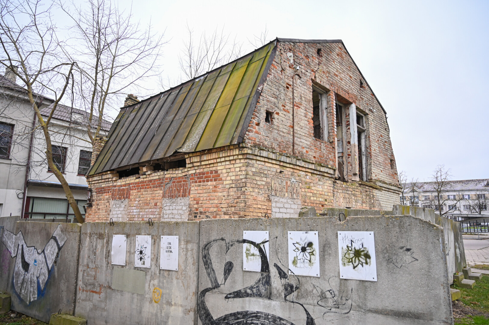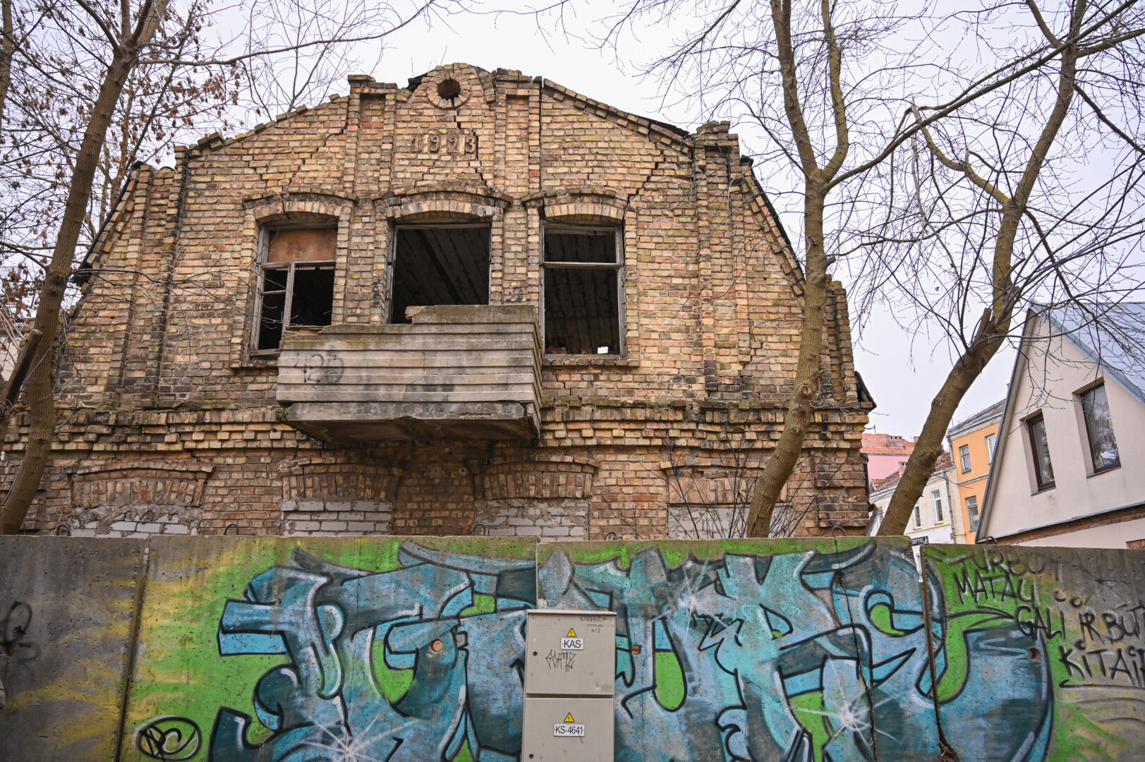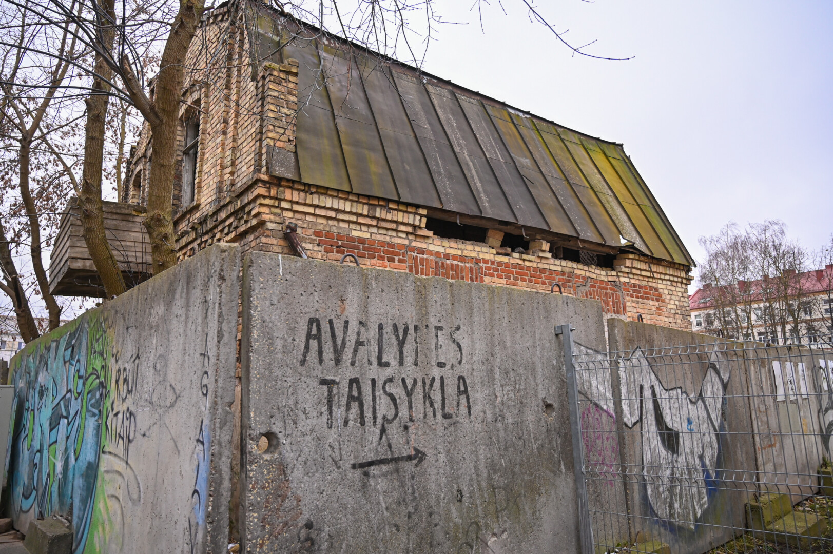 Daugybę metų šiame pastate glausdavosi benamiai, dabar jį juosia grafičiais apipiešta betoninių blokų tvora, langai užmūryti.