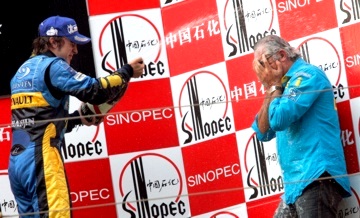 EPA-Eltos nuotr. F.Alonso pergalės šampanu laisto “Renault” komandos vadovą F.Briatorę.
