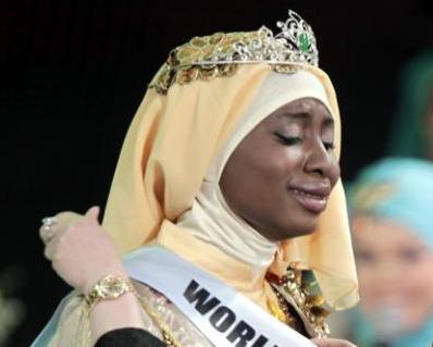 Studentė iš Nigerijos laimėjo musulmonėms skirtą „Mis Pasaulis“ konkursą. Aukso spalvos suknią vilkinti Obabiji Aiša Adžibola apsiverkė, kai jai buvo teikiamas apdovanojimas.