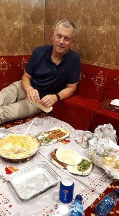 Sauditai, pasak pašnekovo, dažniausiai valgo rankomis, netgi ryžius. Sako, jog taip geriau atsiskleidžia tikrasis maisto skonis. Vyrauja avienos patiekalai.