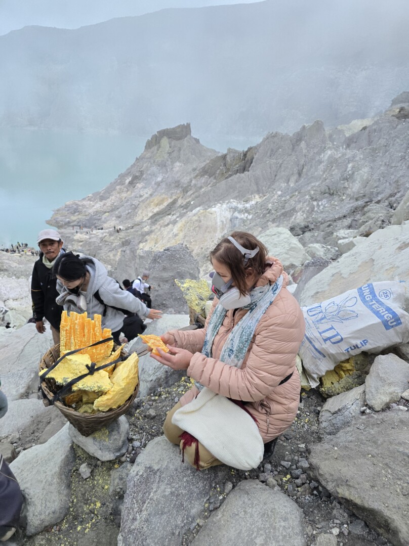 Tokiomis sąlygomis vietiniai dirba be jokių dujokaukių. Jie ne tik lydi turistus, bet ir renka sieros gabalėlius. Pasak G. Pučinskienės, sieros masė atrodo kaip gintaras, tad iš jos gaminami suvenyrai.