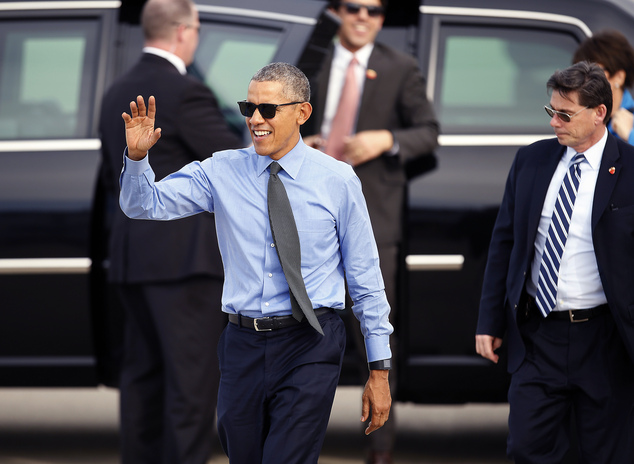 President Barack Obama walks over to the crowd before departing on Air Force One at Moffett Federal Airfield Thursday, Feb. 11, 2016, in Mountain View, Calif. Obama will fly to Los Angeles for more DNC fund raisers, as well as a appearance on comedian Ellen DeGeneres' show. (AP Photo/Tony Avelar)