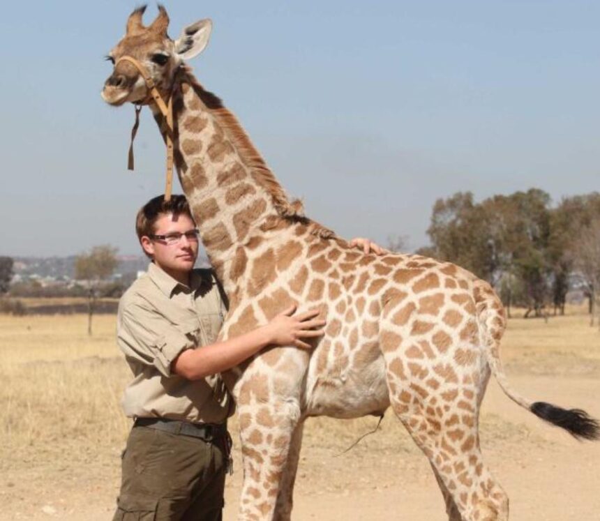 Pietų Afrikoje Šandoras Larenty bando dresuoti trijų mėnesių žirafą Marą, kad ant jos būtų galima jodinėti.