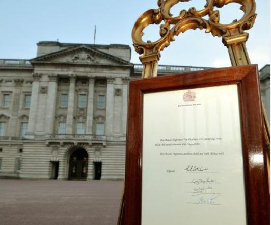 Tik gimus kūdikiui, kurjeris iš Šv. Marijos ligoninės su specialiąja palyda pristatė oficialų dokumentą į Bakingamo rūmus: “Kembridžo hercogienė šiandien 16.24 val. sėkmingai pagimdė sūnų”, – teigiama dokumente, kurį pasirašė kūdikį priėmę gydytojai.