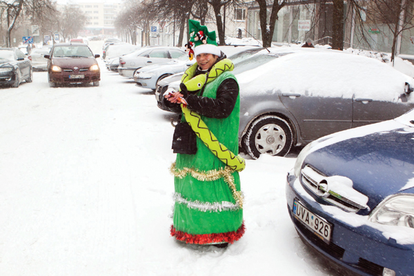 Niekieno neraginama moteris apsivyniojo iš draugės dukrelės pasiskolintą maždaug metro ilgumo žaislą, o galvą pasidabino taip pat vaikiška eglės karūna. Taip pasipuošusi M.Adomėnienė į Savanorių aikštę atvažiavusius vairuotojus pasitiks visą šią savaitę.