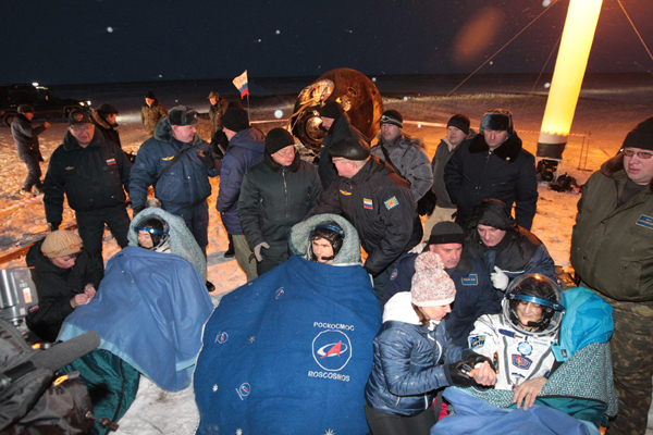 Kosminio laivo “Sojuz TMA-05M” nuleidžiamasis aparatas su trimis Tarptautinės kosminės stoties (TKS) įgulos nariais pirmadienį 3 valandą 53 minutės Lietuvos laiku sėkmingai nusileido Kazachstano stepėje. Tai pranešė Skrydžių valdymo centras (SVC).