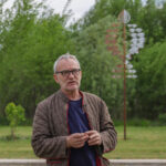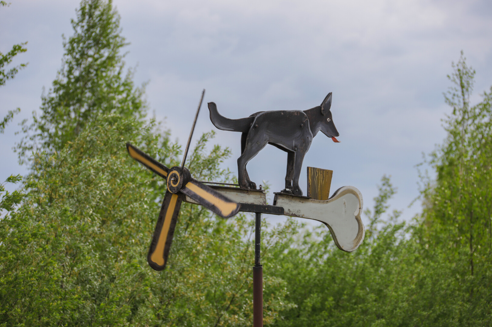 Iš tolo akį traukia ir menininko kieme nuo vėjo besisukančios dvi kinetinės skulptūros.