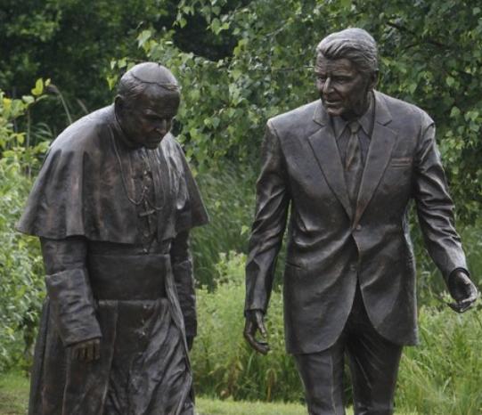 Lenkijoje šeštadienį atidengta bronzinė statula, įamžinanti buvusį Jungtinių Valstijų prezidentą Ronaldą Reiganą ir popiežių Joną Paulių II.
