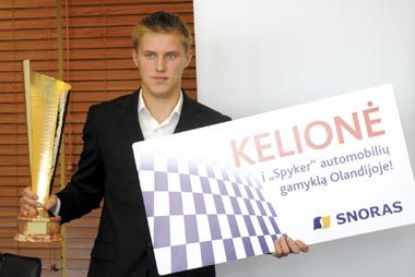 Atvirojo Lietuvos kartingo čempionato masiškiausios KZ2 klasės nugalėtojui Kevinui Gracholskiui praėjusią savaitę pagrindinis šių metų šalies pirmenybių rėmėjas bankas „Snoras“ įteikė taurę ir specialų prizą – kelionę į išskirtinių automobilių „Spyker“ gamyklą Olandijoje.