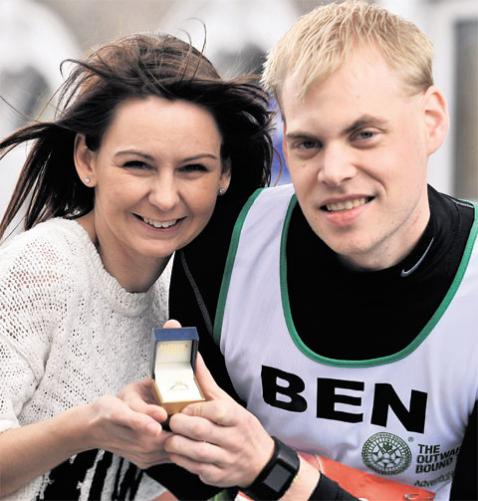 28 metų Benas Makredis 42 km bėgime likus mažiau nei vienam kilometrui sustojo priešais jį palaikančią savo trisdešimtmetę merginą Laurą Rendel ir jai pasipiršo.