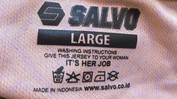 Instrukcija – „Paduokite marškinėlius moteriai. TAI JOS DARBAS“ – buvo atspausdinta ant marškinėlių, kurie buvo sukurti Indonezijos futbolo klubui „Pusamania Borneo“.