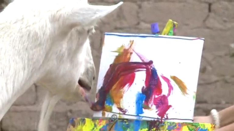 Kristina Rait treniruoja ožį jau kelis mėnesius. Ji parenka dažų spalvą, įbruka teptuką gyvūnui į dantis, ir ožys ima tapyti.