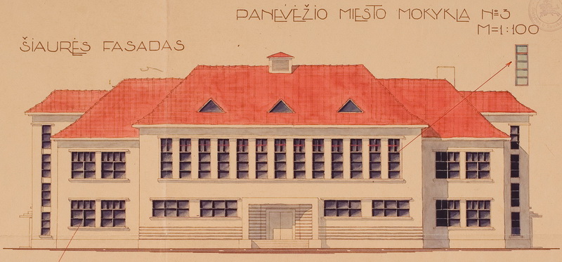 1935-aisiais Antano Gargaso parengtas šešių klasių pradinės mokyklos Ukmergės gatvėje projektas ir jau iškilęs pastatas 4-ojo dešimtmečio pabaigoje. LCVA ir PANEVĖŽIO KRAŠTOTYROS MUZIEJAUS RINKINIŲ (J. ŽITKAUS) nuotr.