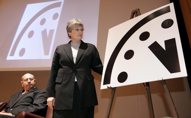 Simbolinis pasaulio pabaigos laiką rodantis laikrodis pasuktas minute į priekį apokalipsės kryptimi. Dėl branduolinio ginklo grėsmės ir klimato kaitos jis dabar rodo be penkių minučių dvyliktą, antradienį pranešė žurnalas “Bulletin of the Atomic Scientists” (BAS), 1947-aisiais inicijavęs “pasaulio pabaigos laikrodį”.