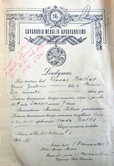 Vladui irgi buvo suteiktas savanorio statusas – tuo pasirūpino vyresnysis brolis Stasys Balčas. Jį V. Balčas gavo tik 1929 metais.