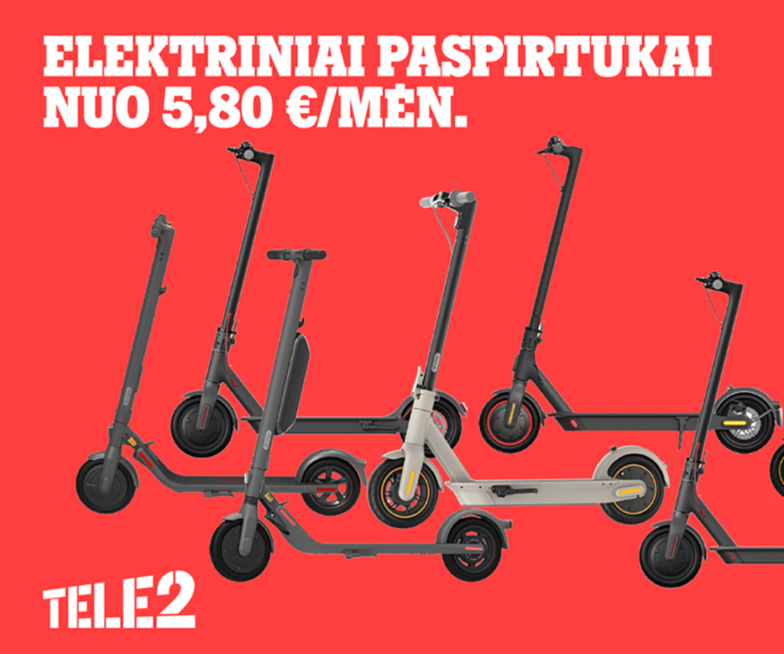 Paspirtukų sezonas jau prasidėjo. Jei ir jūs svajojate įsigyti šią ekologišką dviratę transporto priemonę, dabar tinkamas laikas tai padaryti. Šiuo metu, užsisakius bet kurį „Tele2 Laisvo interneto“ planą su 24 mėn. sutartimi, paspirtukų mėnesinė įmoka prasideda vos nuo 5,80 Eur/mėn. Pradinė įmoka skiriasi priklausomai nuo paspirtuko modelio. Kaina galioja mokant už įrangą dalimis per 36 mėn. Interneto modemo kaina į pasiūlymą neįskaičiuota ir prasideda nuo 2,5 Eur/mėn.