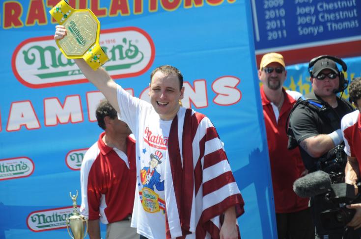 Niujorke jau beveik šimtmetį organizuojami dešrainių valgymo čempionatai. Ketvirtadienį vykusį renginį septintą kartą iš eilės laimėjo 29 metų Džojus Česnutas. Jis per 10 min. suvalgė 69 dešrainius ir vienu pagerino praėjusių metų savo pasiekimą.