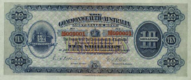 Dešimties šilingų vertės kupiūros numeris M00001. Banknotas priklausė Australijos generalgubernatoriaus Tomaso Denmeno dukteriai, penkerių metų Džuditai. Šią dovaną ji gavo iš Australijos premjero Endriu Fišerio 1913 m. gegužę. Dž. Denman mirė 1987 metais, ir tik po dvylikos metų po jos mirties, 1999-aisiais, banknotas buvo rastas įdėtas į jos knygą.