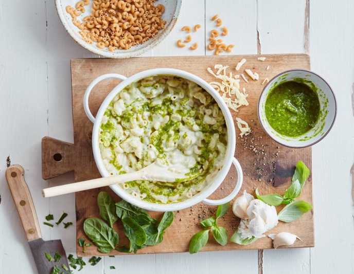 Reikės (8–10 porcijų): 40 g sviesto, 90 g miltų, 275 ml riebaus pieno, 100 g tarkuoto parmezano sūrio, 60 g pesto padažo, 250 g trumpų makaronų (kriauklyčių, suktukų, kitų), druskos, pipirų; uždarui: 40 g sviesto, 60 g džiūvėsių trupinių, 100 g tarkuoto parmezano sūrio.