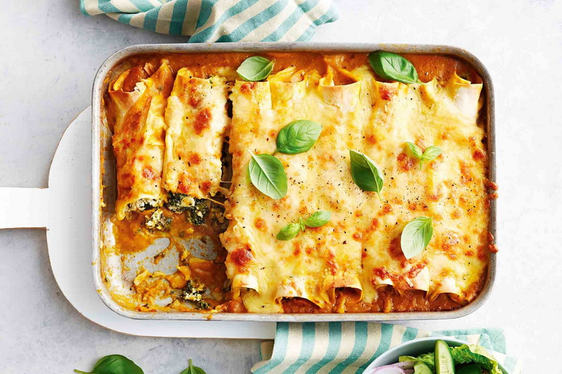 Reikės (6 porcijoms): 8 stambių vamzdelinių makaronų (cannelloni), 250 g nuvalytų krevečių, 200 g šaldytų špinatų, 200 g rikotos sūrio, 100 g tarkuoto parmezano sūrio, druskos, pipirų – pagal skonį; padažui: 200 ml riebios grietinėlės, 1 kiaušinio, 0,5 šaukštelio maltų čiobrelių, 1 baziliko šakelės.