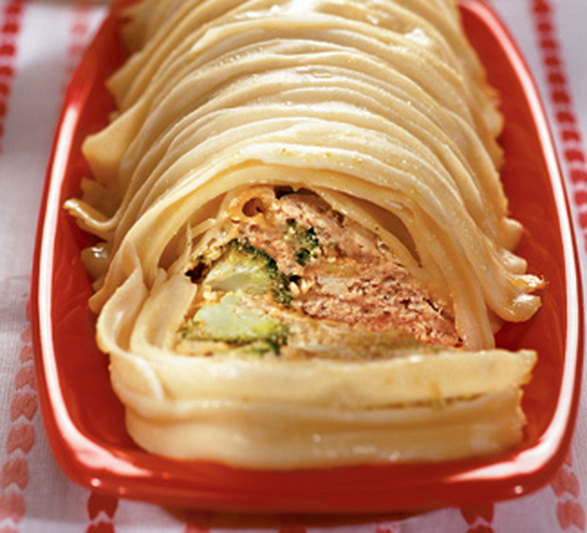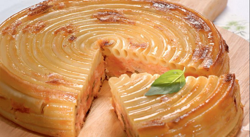 Apvalią kepimo formą ištepkite sviestu. Pradėdami nuo centro, išklokite formos dugną ir pakraščius makaronais. Vidurį pripildę įdaro, uždenkite folija ir pašaukite iki 180 įkaitintą orkaitę 1 valandai.