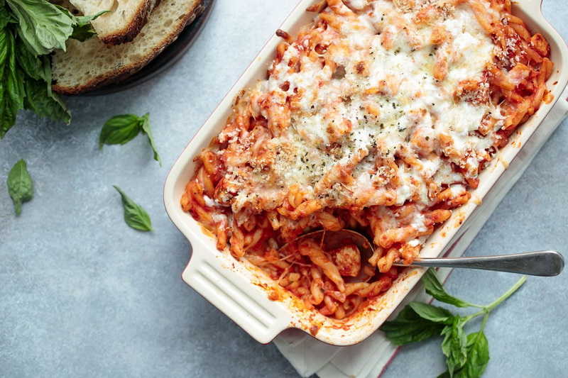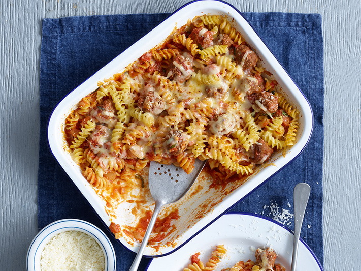 Reikės (4 porcijoms): 100 g tarkuoto sūrio („Edamer“), 2 kiaušinių, 300 g greitai paruošiamų lakštinių su kiaušiniais, 2 šaukštų maltų džiūvėsių, 2 šaukštų sviesto, 3 šaukštų liesos grietinėlės, 400 g konservuotų pomidorų be žievelės savose sultyse, 2 šaukštų picos prieskonių, 2 šaukštų aliejaus, 2 svogūnų.