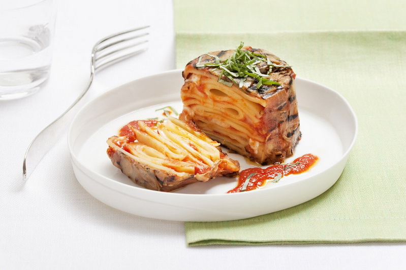 Nedideles 7–8 cm formeles – pavyzdžiui, keksams – sutepkite sviestu. Ant kiekvienos dugno išdėliokite varškės sūrį, ant jo – trečdalį spagečių: susukite juos į lizdelius. Pabarstykite kedrų riešutais, vėl dėkite sluoksnį sūrio, truputį džiovintų pomidorų, ant viršaus – kelis keptų baklažanų griežinėlius. Užbaikite antruoju trečdaliu spagečių, tada vėl riešutais, sūriu, pomidorais, baklažanais. Pabaikite spagečių likučiu taip, kad jie visiškai uždengtų kitus ingredientus.