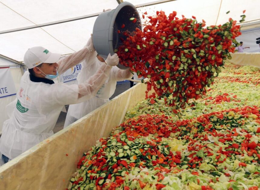 Savanoriai supjaustė kilogramus pomidorų, salotų lapų, agurkų, paprikų, morkų, svogūnų ir alyvuogių. Tada visa tai buvo užpilta 800 litrų alyvuogių aliejaus ir apibarstyta dideliu kiekiu druskos.