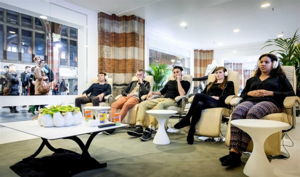 Trys vaikinai ir dvi merginos nuo pirmadienio 18.00 val. stikliniame paviljone Amsterdamo centrinėje geležinkelio stotyje sėdi prie TV ekranų.