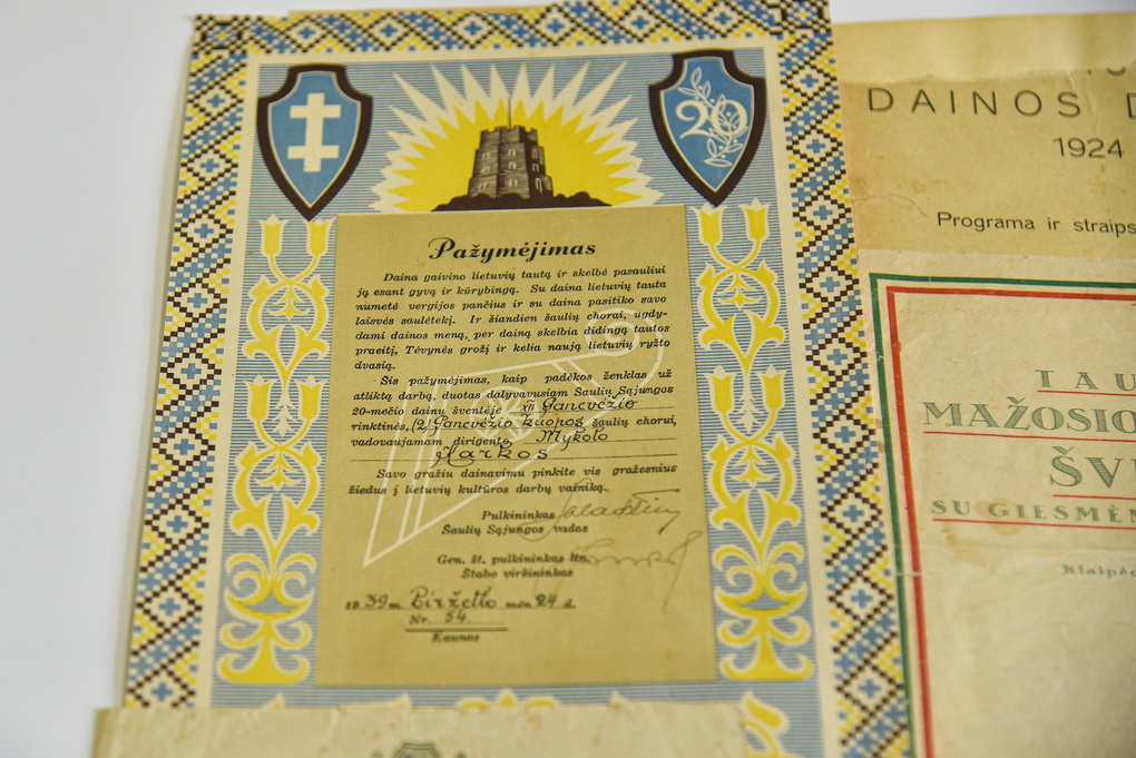 Fondų sergėtojos teigimu, apskritai daug archyvo dokumentų yra susiję su dainų šventėmis – tiek tarpukario, vykusiomis 1927-aisiais, 1928-aisiais, 1930 metais, tiek vėliau – 1942–1977 metais.