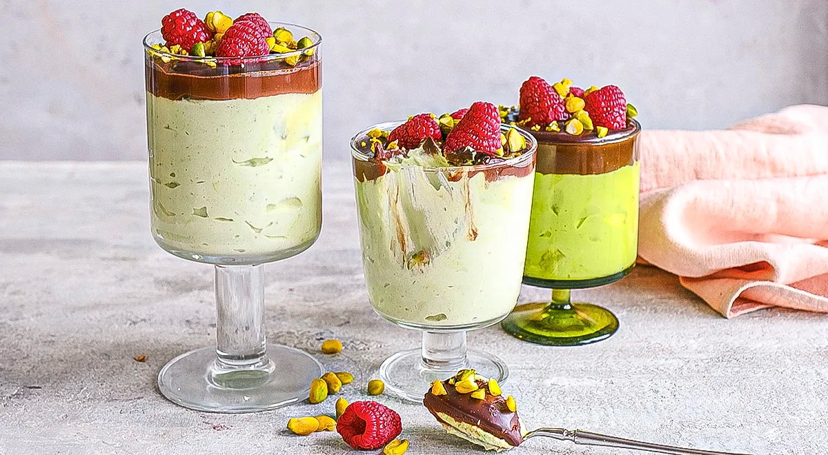 Reikės (4 porcijoms): 2 avokadų, 200 g riebios grietinėlės, 300 g graikiško jogurto, 40 g cukraus, 1 šaukštelio vanilinio cukraus; patiekti: 50 g riebios grietinėlės, 50 g juodojo šokolado (60 proc.), aviečių, pistacijų.