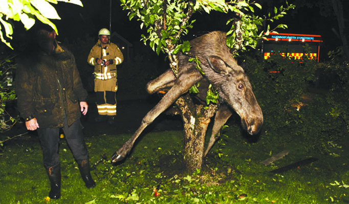 Saro kaimo, esančio netoli Giotenburgo, gyventojai, ko gero, tebeaptarinėja matytą neįprastą vaizdelį – obelyje įstrigusį girtą briedį.