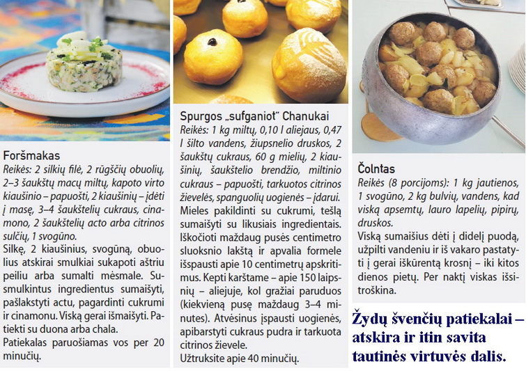 Nepaisant griežtų tikėjimo diktuojamų taisyklių, kurių privalu laikytis judėjams gaminant maistą, žydų virtuvė, patikina A. Jonušytė, labai turtinga. Išsiskirianti savitais skoniais ir pilna įvairių simbolių – ypač šventiniai patiekalai.