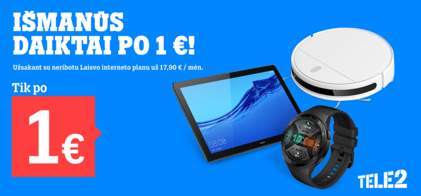 Norėtumėte garso kolonėlės, roboto dulkių siurblio, išmaniojo laikrodžio, planšetės ar belaidžių ausinių? Užsakant neribotą „Tele2 Laisvo interneto“ planą už 17,90 Eur/mėn. ir pasirašant 24 mėn. sutartį, pasirinktą įrenginį galite įsigyti vos už 1 eurą.