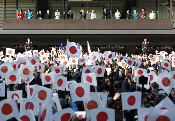 Japonijos monarchas ir jo šeimos nariai sveikino savo pavaldinius iš imperatoriaus rūmų balkono, apsaugoto neperšaunamu stiklu.
