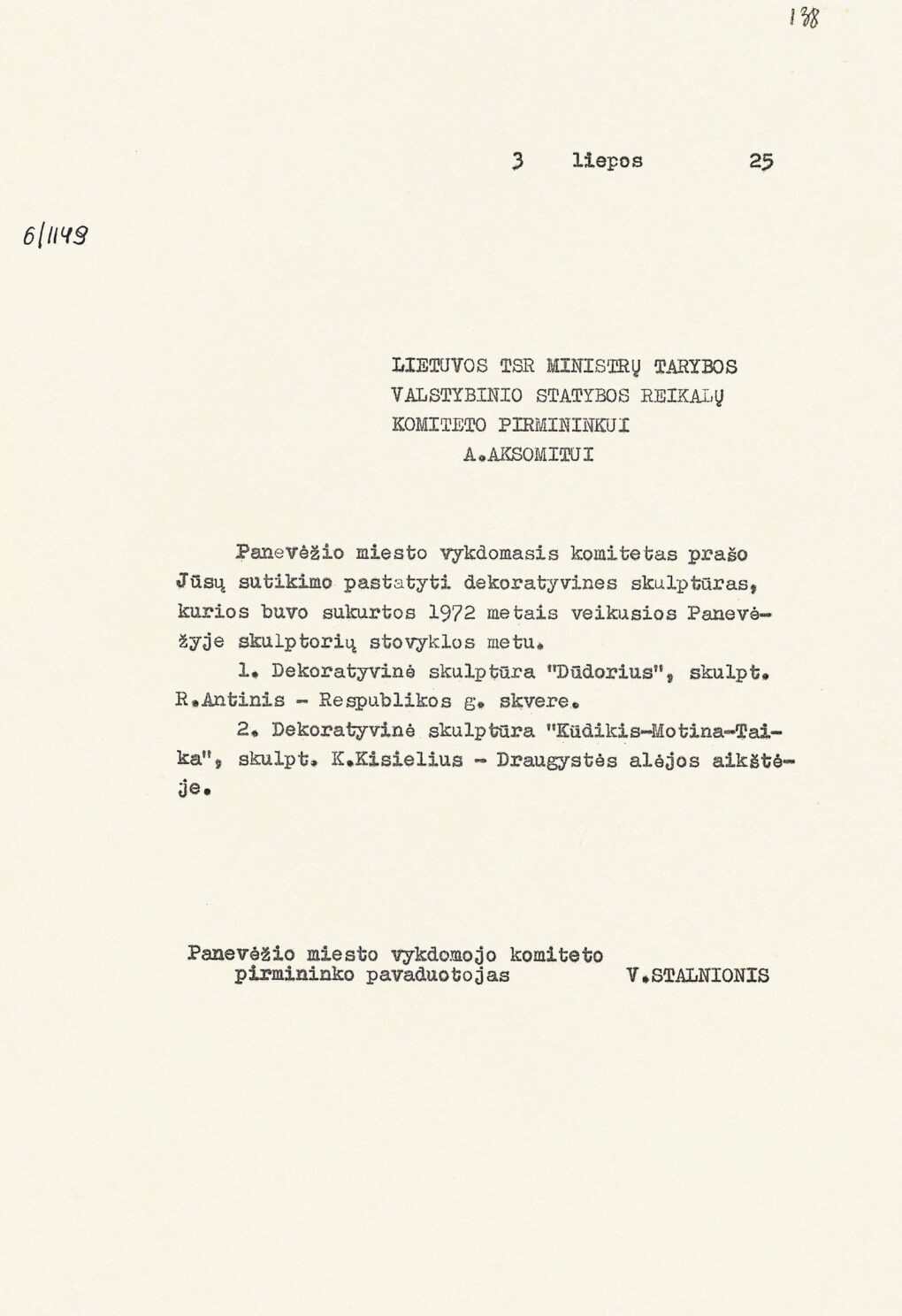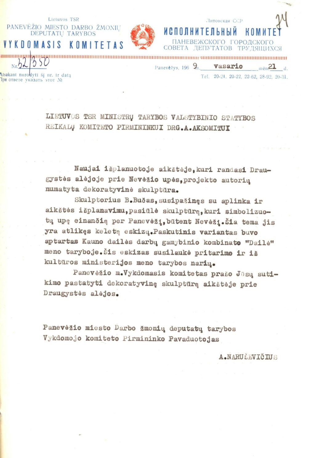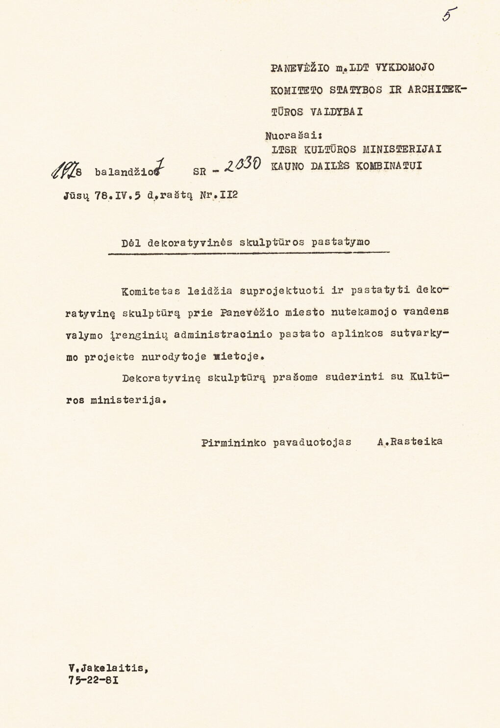 Vis dėlto, sako L. Kaziukonis, Šiaulių regioninio valstybės archyvo Panevėžio filiale pavyko rasti keletą dokumentų, iš kurių matyti, kad 1969 metų vasario 21 dieną Panevėžio miesto vykdomasis komitetas raštu kreipėsi į Valstybinį statybos reikalų komitetą dėl sutikimo pastatyti dekoratyvinę skulptūrą naujai suplanuotoje aikštėje prie Draugystės alėjos – dabartinės A. Jakšto gatvės.