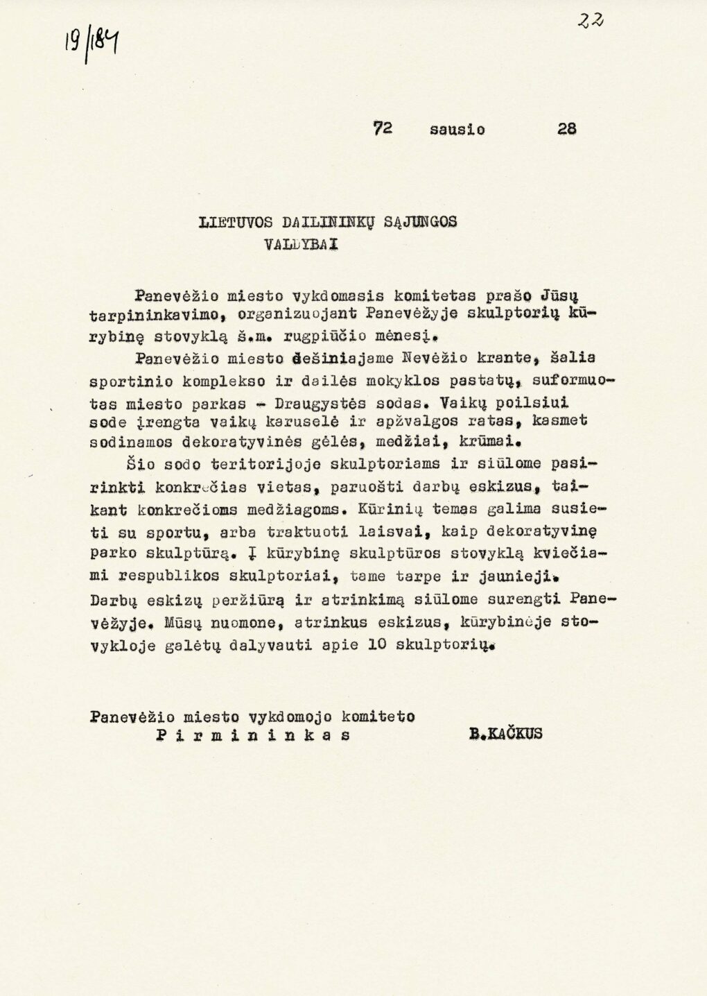 Tų pačių metų sausį Vykdomojo komiteto pirmininkas Bronius Kačkus kreipėsi į Lietuvos dailininkų sąjungos valdybą, kad tarpininkautų Panevėžyje organizuojant skulptorių kūrybinę stovyklą. Menininkams buvo siūloma prie stadiono esančiam parkui – Draugystės sodui – parengti darbų eskizus.