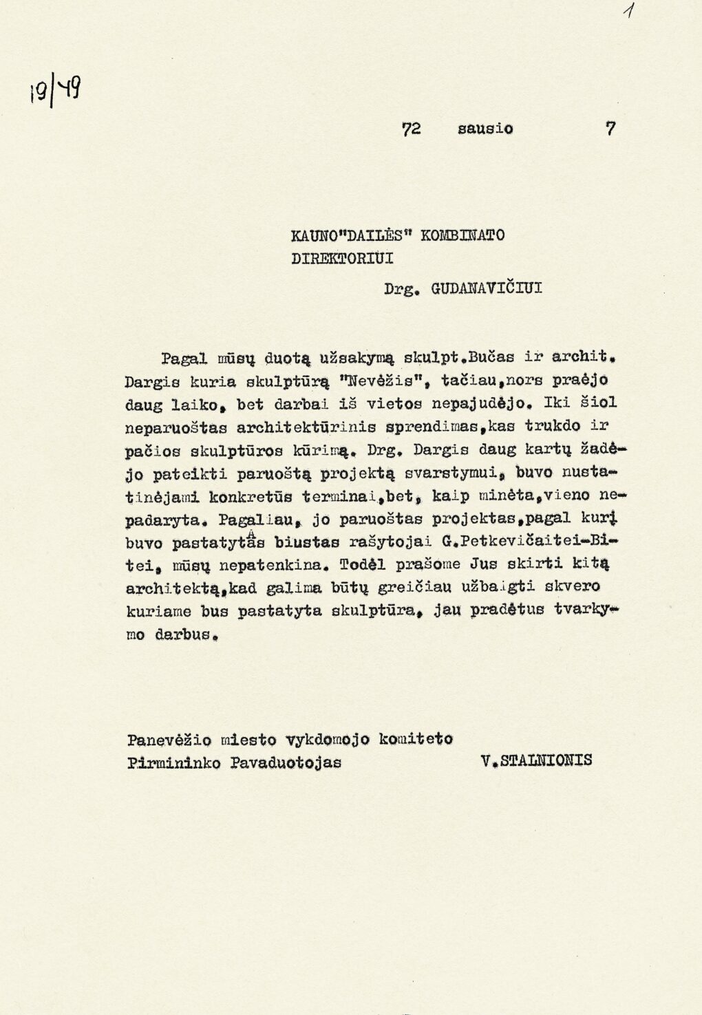 Panevėžio miesto vykdomojo komiteto pirmininko pavaduotojas V. Stalnionis Kauno dailės darbų gamybiniam kombinatui „Dailė“ 1972 metų sausį išsiuntė raštą. Jame nurodė, kad „Nevėžio“ skulptūros pastatymo projektavimo darbai pernelyg ilgai užsitęsė, tad „Dailės“ kombinato direktoriaus paprašė skirti naują architektą. Miestas norėjo greičiau papuošti naująją aikštę. Tik koks buvo atsakymas, pasak L. Kaziukonio, nežinoma. Archyvaro manymu, vertinant vėlesnius įvykius, skulptūros galbūt tiesiog buvo atsisakyta arba pastatymas buvo atidėtas.