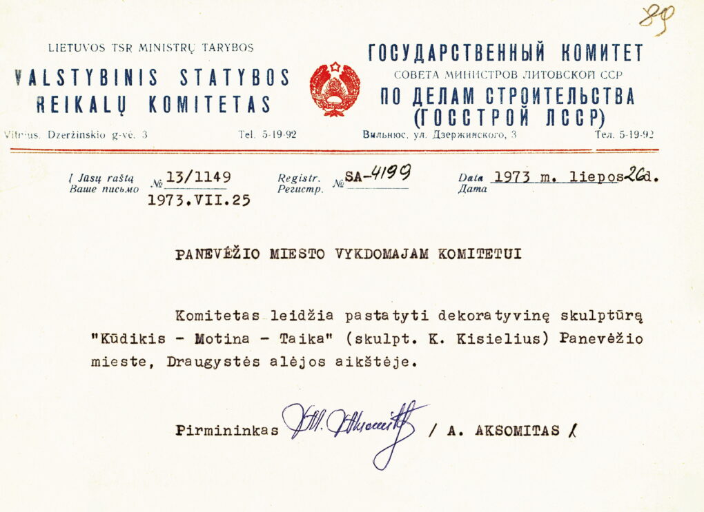 Valstybinis statybos reikalų komitetas tų pačių metų kovą Panevėžio miesto vykdomąjį komitetą informavo leidžiantis minėtoje vietoje skulptūrą statyti. Tik nurodė, kad skulptūros ir aplinkos sutvarkymo projektą reikės suderinti su Statybos reikalų komitetu ir Kultūros ministerija.