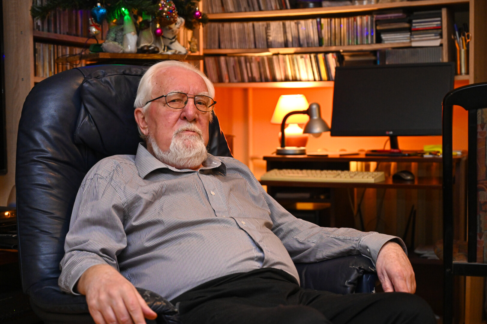 Muzikologo kambario sienas dengia įspūdinga, maždaug 10 tūkstančių kompaktinių diskų kolekcija.