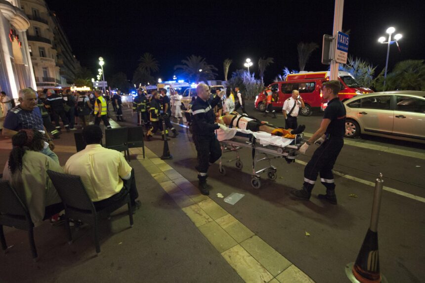 Žymiausioje šio auksiniu tituluojamo miesto gatvėje, garsiajame Anglų bulvare, po fejerverkų, kuriuos stebėjo daugiatūkstantinė Bastilijos paėmimo dieną švenčianti minia, įsirėžė 19-os tonų sunkvežimis. Traiškydamas žmones jis važiavo du kilometrus.